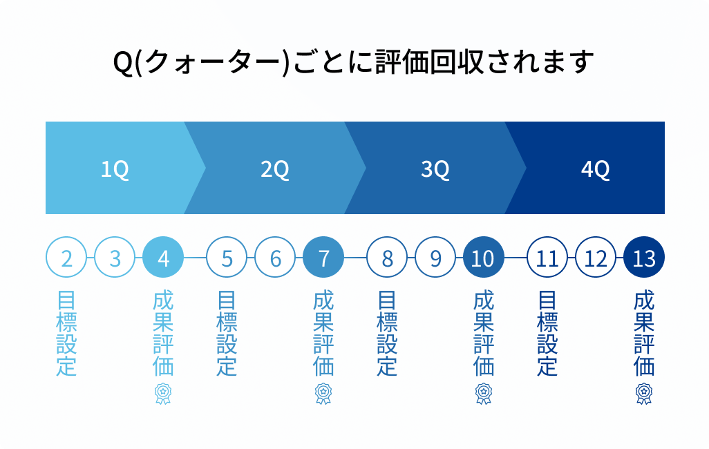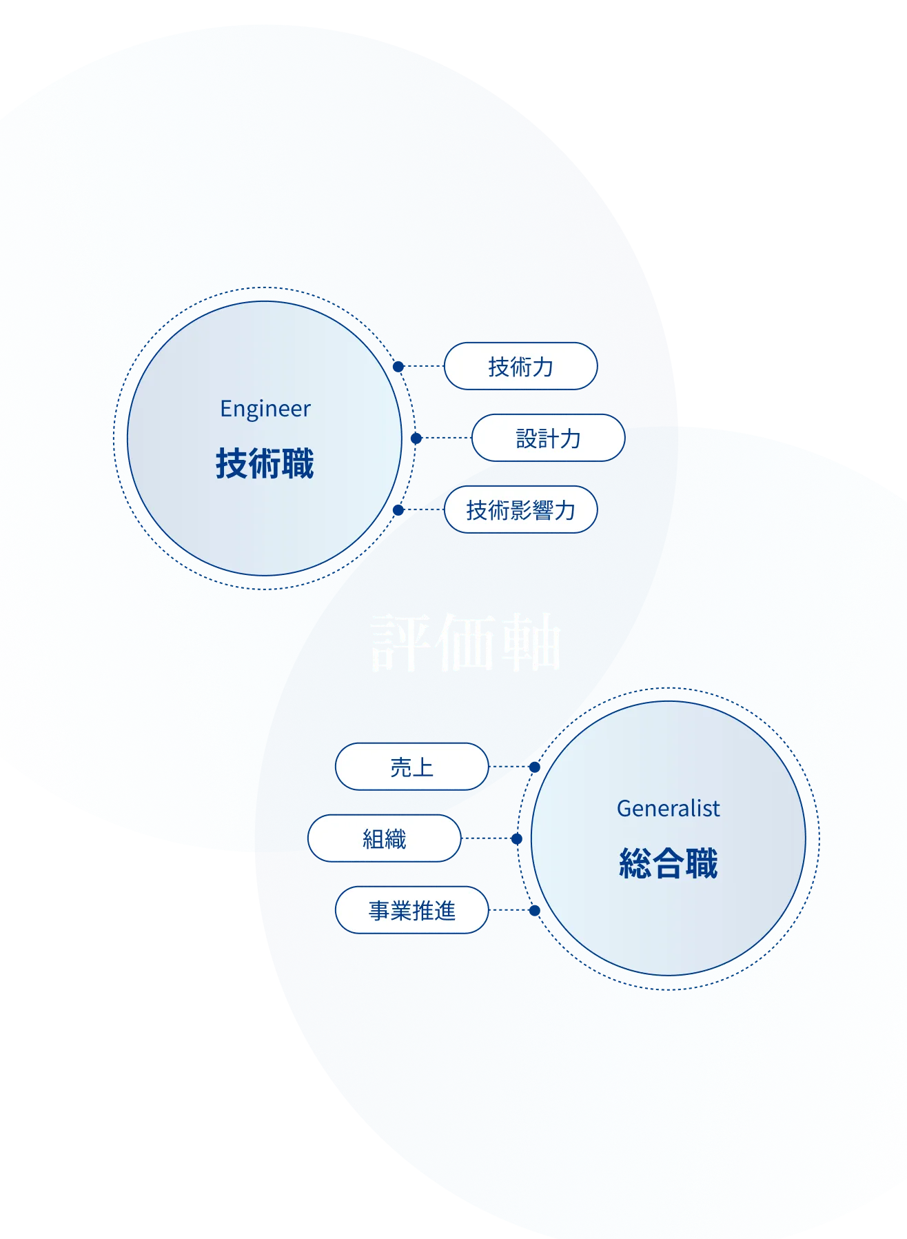 技術職・総合職それぞれ3つの軸で評価。自身の現在地を正しく把握し、今後の指針と目標を明確にするため、年4回、昇格・昇給および目標の見直しを実施しています。評価機会を多く設けることで、PDCAサイクルを高速で回し、成長のスピードと質の向上を図ります。